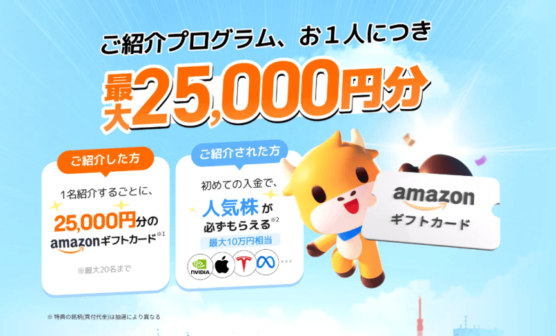 人気株が最大10万円相当の株がもらえるキャンペーンや、1人紹介で最大25,000円もらえる紹介キャンペーンもが激熱!