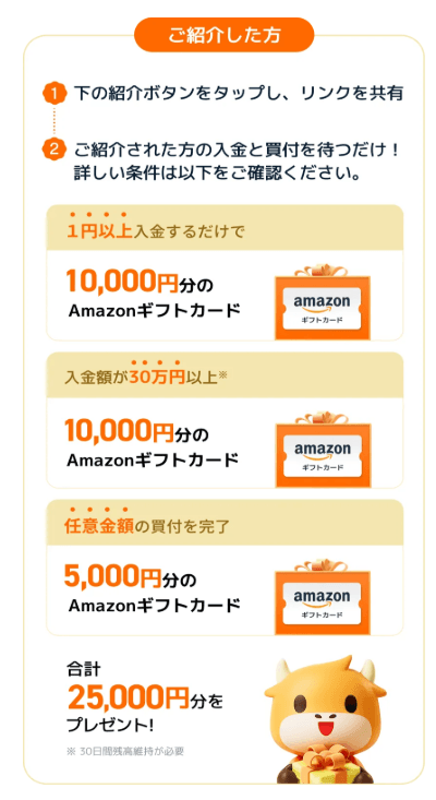- 紹介された方が30万円以上入金+30日間保持でAmazonギフト券1万円